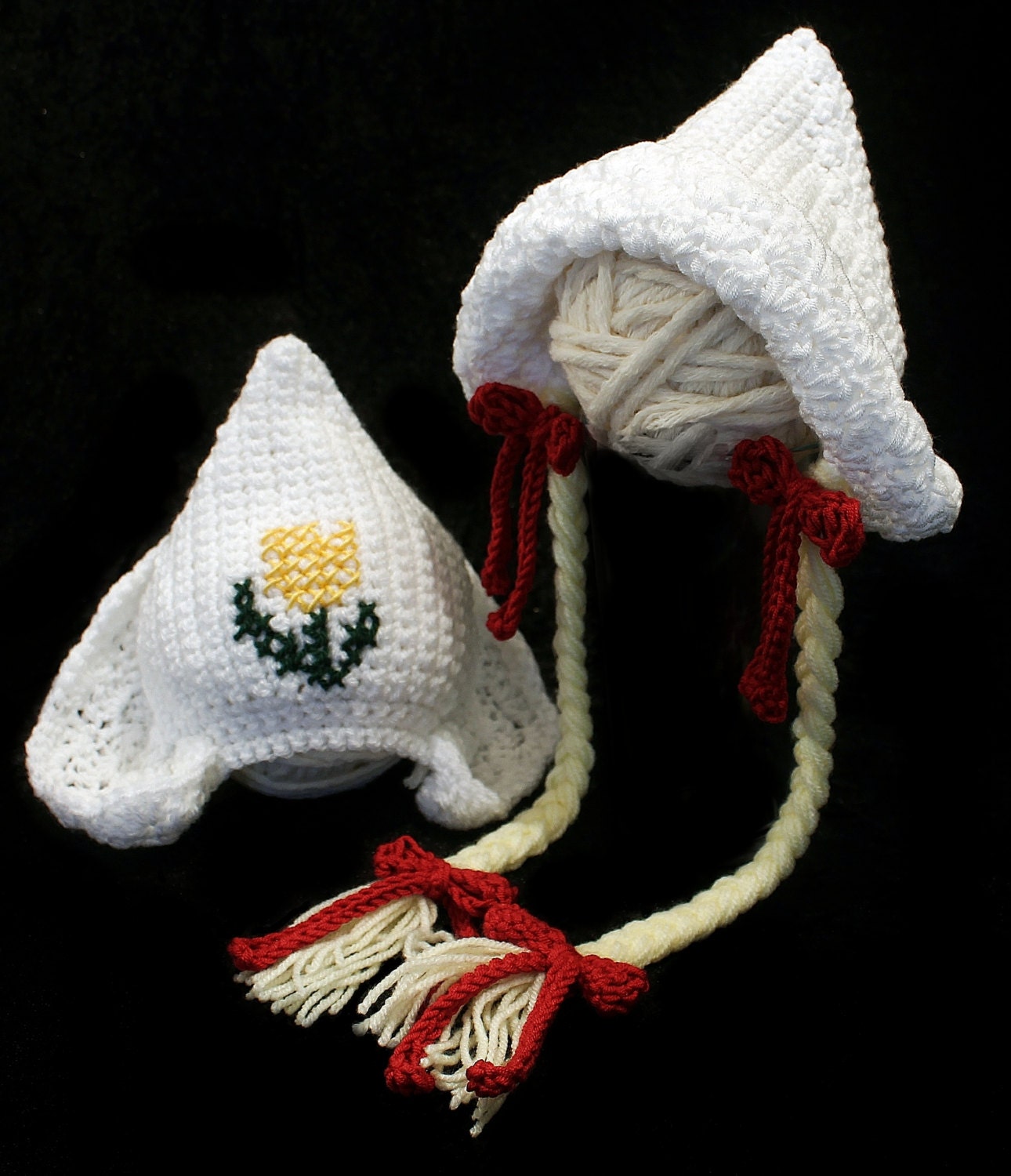 Vintage Knit Dutch Cap Pattern Flower Embroidery